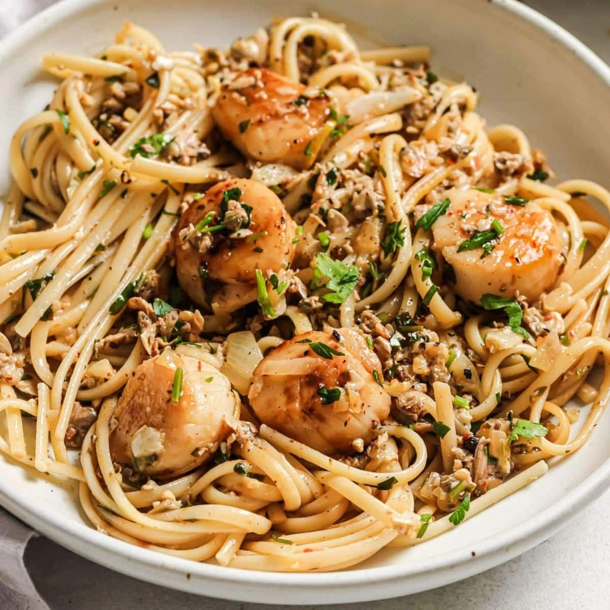- Add the cooked linguine to the skillet with the clam sauce, tossing to coat the pasta evenly. If the sauce seems too thick, add a splash of reserved pasta water to achieve a silky consistency. Finally, fold in the seared scallops and chopped parsley, then plate immediately. The dish should be aromatic, with a bright, citrusy scent and a glossy, buttery finish.
