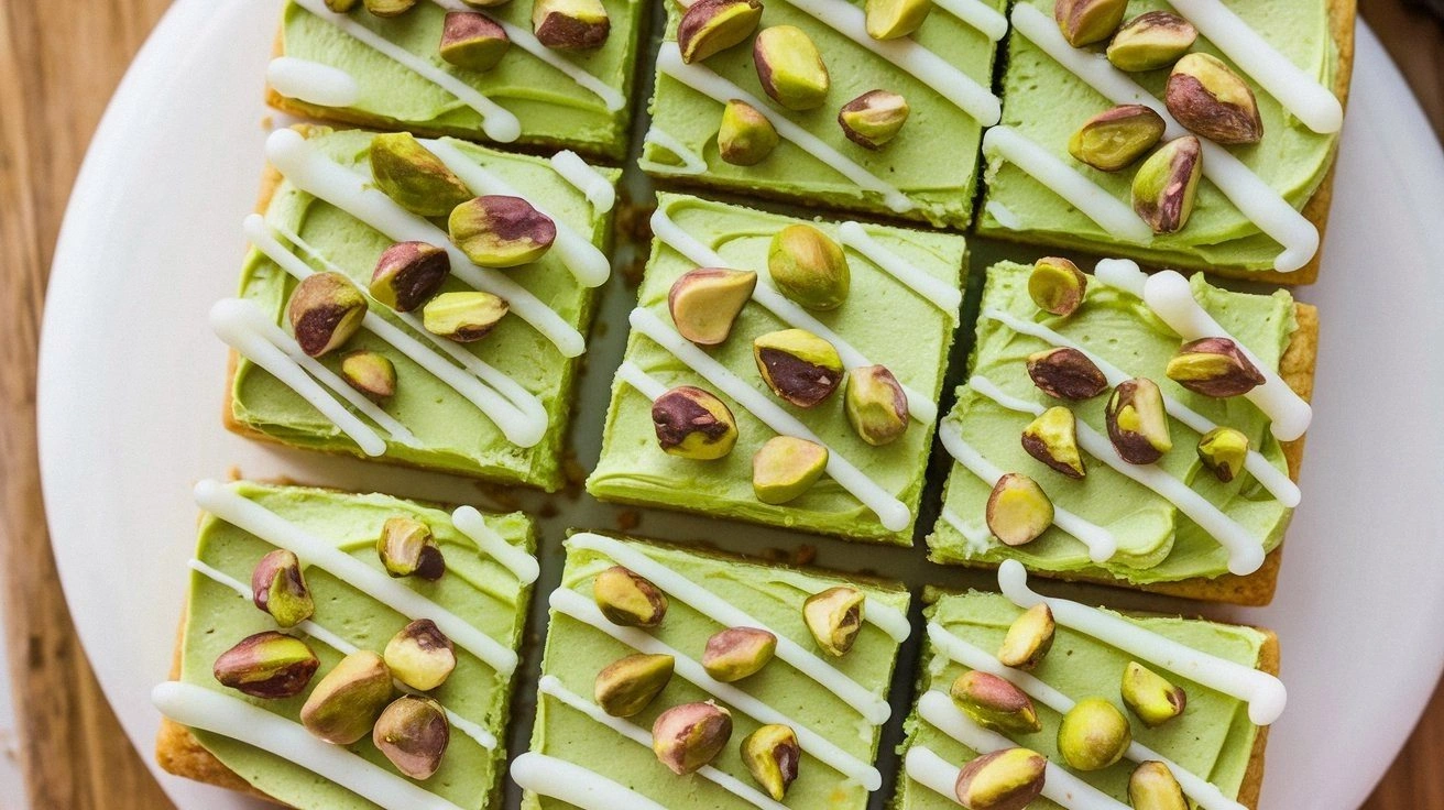After baking, dip the cooled bars in melted chocolate. Let the chocolate set on parchment paper. This adds a glossy finish and a chocolate crunch that pairs with the pistachio.